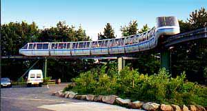You can't pick up a subway system and move it across the planet. In that respect, light rail isn't very mobile either. But it's not a problem with monorail. The track is modular, easily transported and the pylons do not require a lot of ground work if moved. These Von Roll II trains now carry passengers from a remote parking lot to the entrance of this popular park in England, but they once carried thousands of passengers at Expo 86 in Vancouver, Canada. The seven trains carry up to 100 people each. System capacity is 4,800 passengers per hour. Top speed of this peoplemover class system is 27 kph. The monorail system was officially opened by William Shatner (Captain Kirk of Star Trek) on August 13, 1987. |