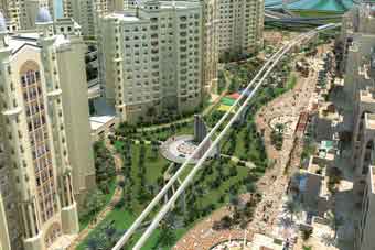 Dubai, United Arab Emirates. The Palm Jumeirah Monorail project is moving ahead swiftly, as seen in a recently discovered photo essay on Skyscrapercity.com (see link below). New pictures show the unique Y-shaped monorail supports are now carrying monorail beams in several locations along the 5.4 km route. A major change was recently announced regarding the look of the central trunk of Palm-shaped island. Originally, the monorail would have followed a straight water channel along the "trunk" of the series of islands. The water channel has been removed from plans, and in its place will be a landscaped park. Computer-generated images show how the newly-revised corridor will look. The park will include a wide range of facilities including a large water element with pools and fountains being key features. Not only will it give residents more space to enjoy, but it will be another example to the world of how monorail blends beautifully with the most modern urban settings, including park settings.