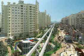Dubai, United Arab Emirates. Pylons have started to appear on the man-made island of Palm Jumeirah near Dubai. Sporting an elegant new Y-shape, the supports are part of a monorail that has the potential of being one of the most visually spectacular transit systems in the world. The island is in the shape of a giant palm tree, easily visible from space. The monorail system will carry visitors from the mainland, along the trunk and to the outer ring known as the Crescent. The track will run over land and water, with eye-popping resort stops along the way. Seen below is a rendering of the planned Trump International Hotel & Tower (note: monorail train is incorrectly rendered). The Hitachi-built monorail system will cruise right under the soaring structure. The 5.4 km system is scheduled to open in 2009.