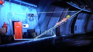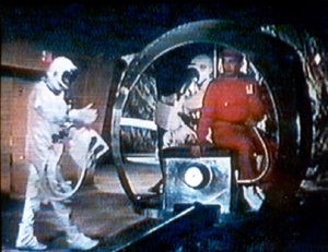 ![]() Bond impersonates a bad-guy astronaut and boards a monorail vehicle