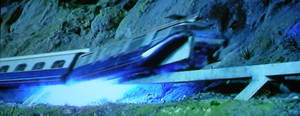 Thunderbirds Are Go! #11 - Brink of Disaster, 1966 (TV, DVD) Warren Grafton is a monorail executive in need of a big infusion of cash to finance his US-based cross-country monorail system. During a test run, a hoverjet crashes and severs an overhanging section of track. Oh no, what do we do? Incidentally, the monorail is suspended, but most of the time it cruises at ground level. Yeah, that makes sense. Puppets and model monorails crashing, what more could you want? |
