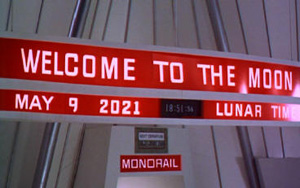 Moon Zero Two, 1969 (Movie, DVD) Do you want campy sci-fi? Well here you go, this one is Mystery Science Theater 3000-approved campy. Think Austin Powers, except this was really released in 1969. The lunar 'monorail' seems to be a bit conflicted. On the poster below, it's clear that it's a suspended monorail. During the movie, we get a look at the interior of the monorail car (or would that be moonorail?), but the view out the window doesn't really match what they show in a wide shot of the lunar surface. The monorail appears to cruising along in a segmented tube on the surface of the moon. No segment breaks are visible from the interior. Oh well, if you're looking for accuracy, this is NOT the film to go to. Whacky fun though.