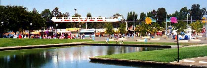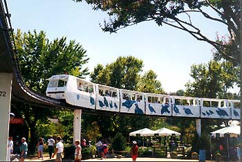 Novelty Monorails - Cal Expo Originally appeared in the Fall 1995 issue of MONORAIL Newsletter... Since 1969, the six Universal Mobility Inc. monorail trains at the California State Fair and Exposition have worn more paint jobs than the extinct Luxor-Excalibur monorail in Las Vegas had passengers. The current incarnation of this Sacramento system's paint scheme is so original that I hope it stays. The four remaining trains are named "California Dog-Faced Butterfly," "California Valley Quail," "California Poppy" and "California Golden Trout." The white trains are emblazoned with each train's namesake along its entire length with the Cal Expo logo on each side.