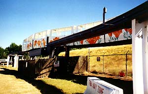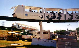 After the first ever sit-down meeting of all four TMS officers aboard the Dog-Faced Butterfly, we were graciously treated to an exhibition of the Poppy train's roll out of shop by Gary Magonigal, the engineer in charge of the Cal Expo monorail's operation and maintenance. While the train was moved by transverser to the spur, Gary told me that two of his trains had been sold to Six Flags Magic Mountain in Valencia, California (Editor Note 2012: Magic Mountain monorail later dismantled). While TMS President Kim Pedersen videoed the operation of the rotary switch and Editor Dale Samuelson took panoramic pictures of the trains, Promotions/Graphics Advisor Paul M. Newitt and I wondered what could have happened at Six Flags to require replacement of two monorail trains... |