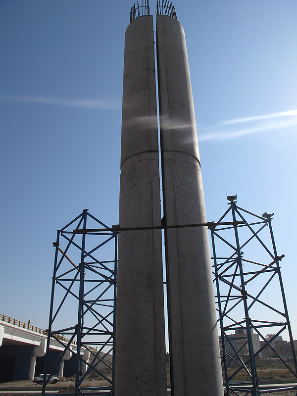A side view of one of the two-section supports where combined pre-stressed monorail track sections will meet.