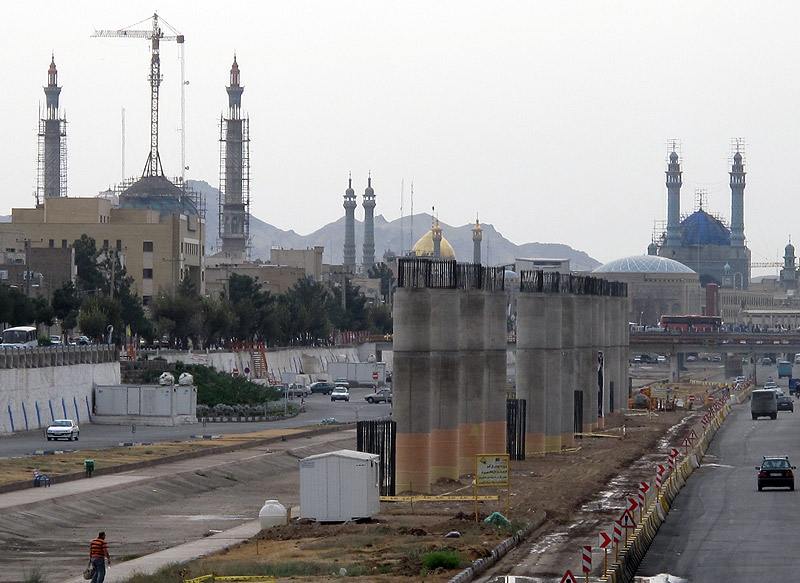 Monorail pylons rising amongst the shrines and mosques of Qom.