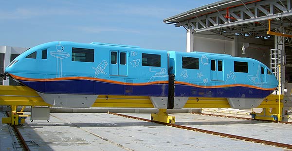 Even though the Hitachi Small class of monorail is smaller than Hitachi's other monorail systems, it still features a flat floor and walk-through trains. To reduce weight, bogies are shared between cars.