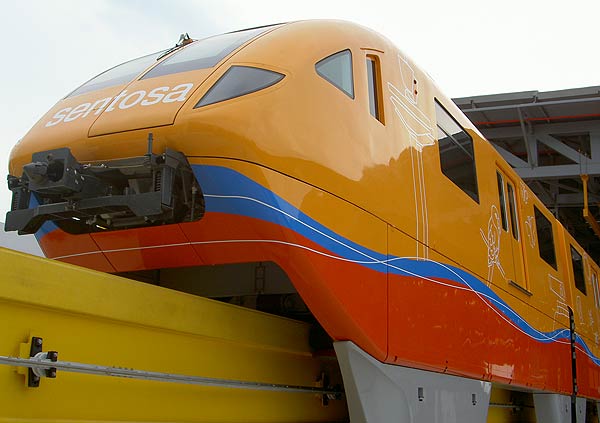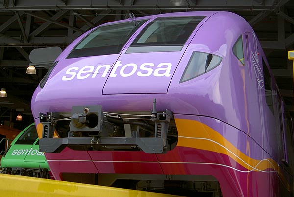Say hello to Miss Blue! The Sentosa Express trains are a colorful assortment of two-car trains. We're at the storage/maintenance facility and Miss Blue is sitting on a transfer track switch.