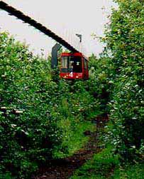 In 1973, the Siemens Research Center in Erlangen began tests of a 1.4-km test track of a suspended peoplemover-scale monorail. With wheels and running surfaces inside a steel beam, the German monorail is a close cousin to the Safege Monorail developed in France (see Monorails In History-Part II). With knowledge gained at the test track, the first revenue passenger service "H-Bahn" opened at Dortmund University in 1984. The initial line was only 1 km long but connected two segments of the Universtity separated by a valley and a major roadway. The system was so popular with students and faculty that more than five million passengers had been carried by 1991 (in complete safety). With this success came backing for extensions. Additional track was added at both the south and north end. A spur line and switch was added which allows passengers to transfer to an urban rail line directly below the DO-Universität station. A new 1.2 km line to a nearby science park opened in 2003. Top speed of the the vehicles is 65 kph. With a minimum frequency of 40 seconds there are 36 scheduled runs per hour. Further extensions are being planned. (See our Links Page to go direct to the Dortmund H-Bahn Site) |