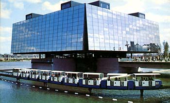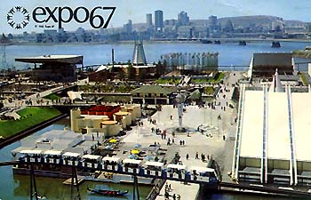 First, the Minirail, as it was called, operated two different kinds of trains on three different loop systems. One set of trains was constructed in Switzerland in 1964. The other set of trains was constructed in Montreal especially for the expo. Secondly, the system ran over water, through the giant "skybreak geodesic dome" of the United States Pavilion (What is it with the "big ball" at these things? Look at the Perisphere at the '39 World's Fair, the Unisphere at the '64 World's Fair--or is that thing even still there after the movie Men in Black?--[editor note: the 1964 Unisphere still stands!], and the theme pavilion at Expo 86, not to mention Spaceship Earth at Epcot.), and beneath water falls while giving its passengers an all-inclusive view of the fairgrounds while whisking them on their way to their next destination.
