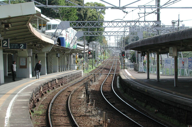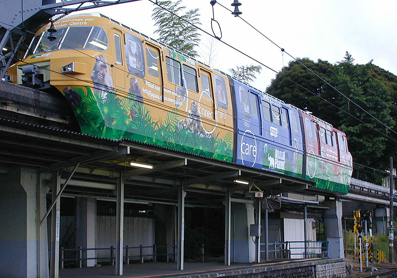The monorail platform is right above the conventional rail station, and both the monorail and rail line are operated by the Nagoya Railroad (Meitetsu). Those two young men on the platform happen to be my sons, who have been forced to ride monorails with the old man in Australia, Japan, Europe and across America.