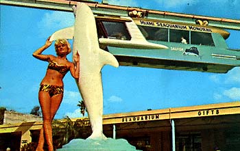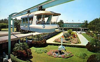 Novelty Monorails - Miami Seaquarium Spacerail This article appeared in the Winter 1995 issue of MONORAIL Newsletter... Constructed in 1963, the monorail at this famous sea-life park was billed as the first of its kind on the East Coast. Suspended on the 2385 foot long guideway, the five cars (with one in reserve) carried guests on a six mph trip past show and exhibit buildings until its demise in 1991, when track demolition was started to make way for a park expansion that did not include the monorail. The original cars were named for fish and had operating headlights and air conditioning. In 1978, the cars were re-skinned with boxier, less unique bodies. Anti-collision systems were automatic with block zones, controlled by an operator at the central console.