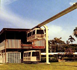 It is enigmatic to note that one of the chief reasons that the system now sits as rusting, half-demolished guideway is that the monorail was low in ridership because it had LOST ITS NOVELTY AS A RIDE! After talk of using the system as transportation from a remote parking facility died down, park expansion plans dropped the monorail and all six cars remain backstage, doing ignoble duty as storage sheds. But there is hope for these trusty carriages; the Palm Beach & Lake Worth Scenic Railway Museum is trying to purchase them to restore as an important segment of railroad history. |