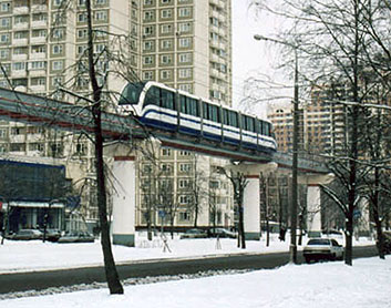 The Moscow Monorail is based on Intamin technology, with many modifications designed in by the Moscow Institute of Thermal Technology. The 4.7-kilometer system started operating in January of 2005. Heating equipment has been installed in the guideway to deal with Russia's harsh winters. For more information and spectacular images, see the Moscow Monorail Photo Essay in our Special Features section. |