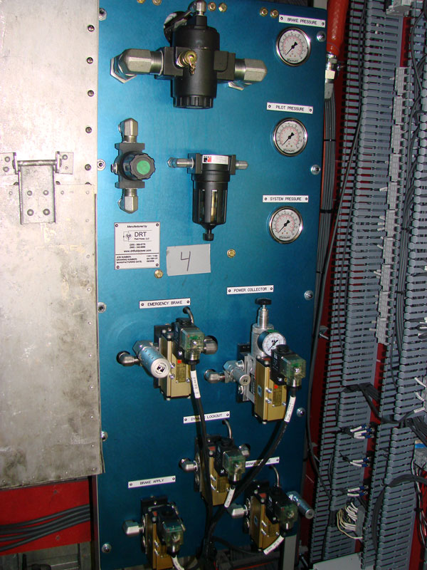 Russ: The blue-anodized panel is the pneumatic brake panel. There is one per car. These panels are a new brake design that replaced the old, rusted, worn out Westinghouse transit design from 1961. All tubing throughout the trains is now stainless steel, and the panel valves are stock off-the-shelf industrial valves and regulators found in heavy industrial operations. They are simple to troubleshoot and replace, although we have never had to touch them, since installation in Blue Train!