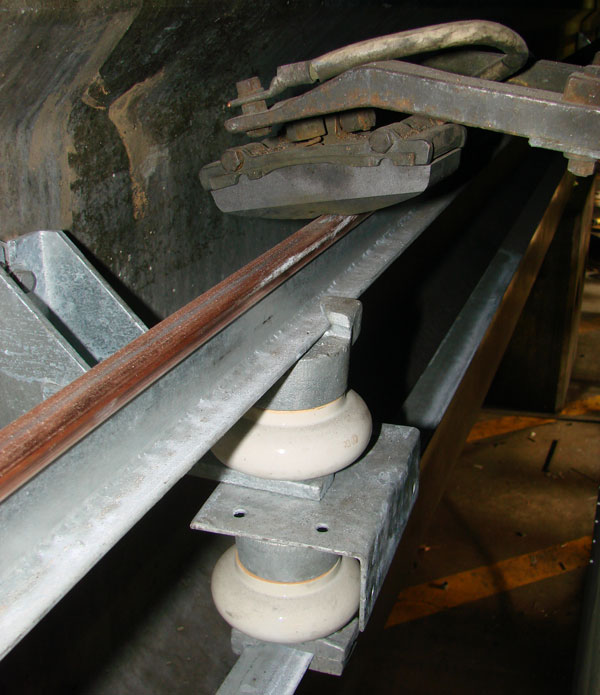 Russ: This negative collector rides on the upper rail. The positive collector is held up against the bottom rail by a pneumatic cylinder. This allows the collectors to be dropped remotely (from the drivers cabs) when required.