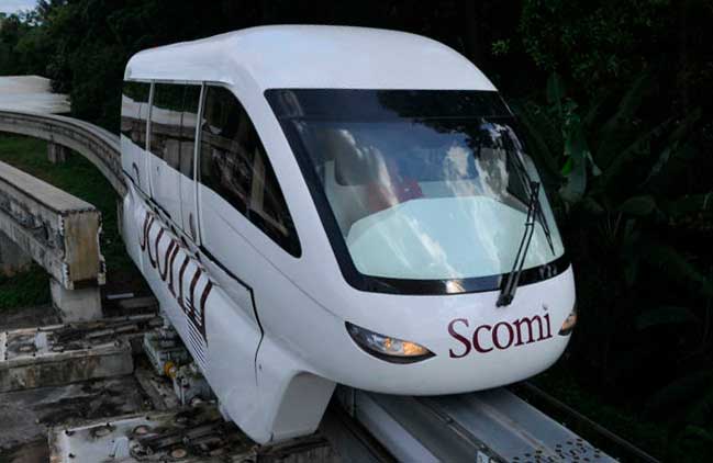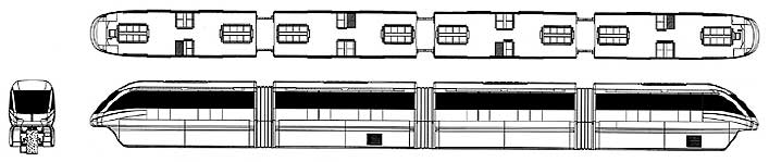 | The car bodies have a steel chassis, stainless steel structure and make use of aluminum and composite structures. Weight of each car of the train is 15000 kg. The length of a two car train is 23.4 m and a 4-car train would be 44.8m in length. The train is 3.08 meters wide and 4.33 meters tall. Capacities range from 106 to 125 passengers/car, depending on seating configuration (20 or 24.)  In the standard Alweg tradition, walk-through between the trains is provided. There are 2, 1.5m doors on each side each car (4 total per car.)  Distance from top of beam to floor is 70cm (.7m,) which is significantly less than the current Hitachi designs in Japan. Load tires are metro-type, nitrogen filled with internal run-flat capability.  They are 1.006m in diameter when new. |  |