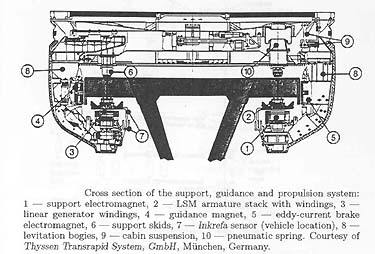 Transrapid utilizes (EMS) non-contact levitation, guidance and propulsion systems that safely and efficiently move the vehicle down a fixed guideway. Vehicle levitation is achieved by the attraction between the ferromagnetic stator packs mounted on the guideway (passive portion) and the individually controlled magnets located in the vehicle undercarriage (active portion). Lateral guidance is attained by the interaction of guidance magnets, mounted to the side of the vehicle undercarriage, and the steel guidance rails, attached to the guideway. Individual levitation and guidance magnets are grouped together and mounted continuously on both sides along the entire length of the vehicle. Likewise, system components mounted to the guideway, are fixed continuously on both sides. At stopping areas where the vehicle is set down, sliding rails on the top of the guideway support the vehicle. During operation, a highly reliable and redundant electrical control system ensures that the vehicle levitates at a constant distance of three-eighths of an inch (10 mm) from the guideway at all speeds. A secondary suspension us used with pneumatic springs. Cutaway of TR-07 running gear. |
