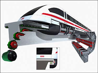 Propulsion is accomplished through a long-stator linear synchronous motor fixed to the underside of the guideway. The concept derives from that of a standard electric motor, except that the stator and cable windings are cut and placed lengthwise along the guideway. The magnets, acting as the excitation for the motor, are mounted on the vehicle undercarriage. Therefore, instead of a rotating magnetic field, a traveling magnetic field is created by adding electrical current to the system.