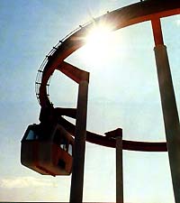 Titan Global's history dates back to the Miami Seaquarium Monorail, which was built in 1962. It withstood many hurricanes, but its novelty had lessened and it was removed in the early 1990's. Another Titan product was the Los Angeles Fair monorail which operated in Pomona, California for 24 years. But by far the most impressive Titan system was the first demand-repsponsive, automated transit system with a then-unmatched operating record of 99.9% availability in over thirteen years of revenue service. That was the Jetrail Monorail system at Love Field in Dallas, Texas (pictured at right). Since then Titan has worked on several proposed projects, but no new I-Beam monorails have resulted from studies. Titan Global offers three different linear motor monorail systems: The "PRT" system operates at a speed of 12-15 mph and utilizes a 4-20 passenger vehicle. The "JETRAIL" systems operates at a speed of 35 mph and utilizes a 30-50 passenger vehicle. The "ASTROGLIDE" system operates at a speed of 50-70 mph and features a 75 passenger vehicle with a crush load of 112 passengers. |