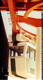 | The footprint of the Titan system is limited to the small area required by their caisson foundations. As with other monorail systems, track sections are preassembled off-site to keep field construction costs to a minimum. The Titan guideway is so adaptable that it can be designed to weave through complex areas eliminating the need to make major modifications to existing structures. Columns can be as far apart as 100 feet. Titan suspended vehicles can navigate a 15 foot radius, making it one of the tightest turning monorails available (if not the tightest). | ![]() |