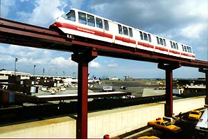 A seven-car train is 32.12m (105.3') long, 2.06m (6.8') wide, 2.6m (8.5'). End cars are 5.55m (18.2') long and intermediate cars are 4.12m (13.5') long. Each train normally holds about 130 passengers, with a maximum number of 170 passengers. |