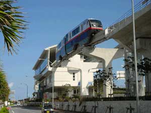 The Okinawa Urban Monorail is the first rail system on the island of Okinawa since World War II. Following the precedents set by earlier monorails in Japan, the Naha dual-beamed line connects city points with the airport. Starting at the airport, the line runs northeast through the city center. The guideway terminates at Tera. Including the thirteen stops along the route, end to end journey time is around 30 minutes. Trains run every six minutes during peak periods. Following a precedent set almost a century earlier in Wuppertal, part of the line follows along a river channel. Good ideas bear repeating. In 2012, a 4.1 kilometer extension was approved. The line will be an extension from the Shuri Station at the northeastern end of the line. Completion is expected by 2019.
