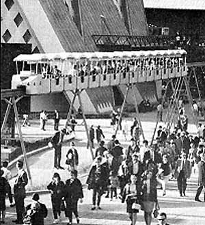 Expo 67 had an extensive minirail system. Three separate track loops covered almost all points of the fairgrounds. One loop remains today at the La Ronde amusement park, an outgrowth of a smaller entertainment center of Expo 67. The trains were originally assembled in Switzerland and first operated at the 1964 Swiss International Exhibition in Lauzanne. The picture here shows one of the trains as they appeared in 1967.