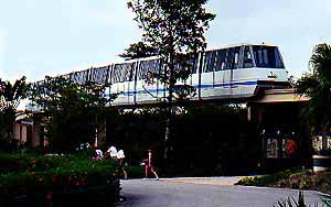 The Miami MetroZoo monorail crosses zoo walkways 30 times, a safety nightmare if surface rail had been chosen. But it wasn't, so zoo visitors in Miami are safe. The zoo wasn't so safe when Hurricane Andrew devastated the area in August of 1992. Just about everything at the park was shredded. However, most of the monorail guideway survived, as well as the trains. The monorail was giving tours of the devastation soon after and today the zoo is back in full swing. The monorail was built by Universal Mobility Inc. The rights to the technology have since been acquired by Bombardier. With modifications by Bombardier, new UM monorails have since opened at Tampa and Jacksonville (see below). Photograph by TMS Associate Editor Dale Samuelson.