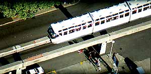 In 1994 Bombardier was selected by the Jacksonville Transportation Authority (JTA) to replace its existing Matra-built peoplemover with a totally automated monorail system. The first two-station segment of the "Skyway" monorail opened in 1997. The UMIII trains are similar to their predecessors in Tampa, but run on concrete beams instead of steel. The beam is placed on top of the massive Matra guideway, and unfortunately JTA has elected to continue using the obtrusive support structure for Skyway track extensions. A tragic fatal accident has already occurred to a worker on the structure next to the beam. If more extensions are built, hopefully only narrow monorail track and a centerline catwalk will be included, like at Newark International. Maximum speed of the two-car trains is 48 kph. The system layout consists of two pinched loops that merge at a level Y-junction. Additional vehicles can be added to trains as the system grows.