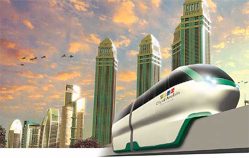 Dubai, United Arab Emirates. Metrail AG of Switzerland has been awarded the monorail contract for the City of Arabia, UAE. The City of Arabia is a 20 million square foot retail, residential, commercial and entertainment development near Dubai. Signature elements are the Mall of Arabia, one of the worlds largest malls; Restless Planet - a US $300 million theme park, an earth science museum and planetarium; Wadi Walk, a water front community with stylish apartments, outdoors cafes and retail outlets; Elite Towers, a group of 34 commercial and residential buildings. Metrail was chosen because of lower capital costs and also the recurring operational costs are about 10% of those offered by the five other well established multinational bidders. The Metrail monorail will transport residents and visitors around the development on a six-kilometer dual guideway system with eleven stations. Six flat-floor, walk-through 2-car trains will be supplied. Unique to Metrail is their hybrid power system, in which no electrical busbars or sub stations along the guideway are required to power the vehicles. 'Metrail Plus' trains will be used, which feature a low voltage, regenerative and multi-wheel drive system. Onboard auxilary power units (APU) generate the power required to propel 6-wheel bogies of the train. Frazer-Nash permanent magnet brushless motors are strong enough to help trains to climb 15% grades. The bogie design also permits turns within a tight 20-meter radius when necessary. Bill Muir, Senior Vice President-Project Management for City of Arabia, stated From the outset, we looked for a transportation system that would complement our project. The Metrail monorail requires no electrical infrastructure and its light weight allows for imaginative station and guideway designs. Metrails unique and advanced green technology will add to the Galadari Groups commitment to the environment. Bill Armstrong, Chief Operating Officer of Metrail, said "Metrail is confident that the success of the City of Arabia project will unlock the considerable potential for other Metrail monorail mass transit projects to be carried out not only in the UAE but also in the rest of the world. The first alignment of the system is planned to be operational in a remarkably short twelve to eighteen months from now.