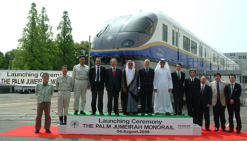 Kasado, Japan. Following final inspections by Hitachi Ltd. at the company's Kasado manufacturing plant, the Palm Jumeirah monorail trains were presented in a handover ceremony on August 4th. The Palm Monorail will be the first monorail in the Middle East. Testing is scheduled to begin in October, with system operation in the Spring of 2009. Hitachi Ltd. has graciously shared the following images from the ceremony.