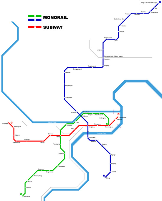 Chongqing, China. Chongqing's second monorail line has started trial operations. China's first major monorail system first opened in Chongqing with Line 2 in 2005 (Line 1 is subway). Line 3 is the latest addition to the city's growing metro system, and makes the Chongqing Monorail the longest in the world, surpassing the previous record holder in Osaka, Japan. It is the first monorail system in the world with two lines crossing each other. Line 3 also features the highest river crossing of any monorail system in the world, with its crossing of the Jialing River on the new Chongqing Yu'ao Jialingjiang Bridge. Other monorails have spur lines with crossovers, but none where the system lines form an X. The new Line 3 adds almost 18 kilometers to the monorail system, which is now totals around 35 kilometers. An extension to the north is under construction, which will connect Line 3 to the airport. Another extension is planned for Line 3, to the south via a subway under the Yangtze River.