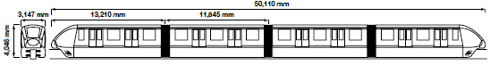 Dimensions - INNOVIA Monorail 300 is slightly larger: a 4-car INNOVIA Monorail 300 is 50,110 mm long compared to 4-car Las Vegas at 42,196 mm, the width of INNOVIA Monorail 300 is 3,147 mm compared to 2,635 mm