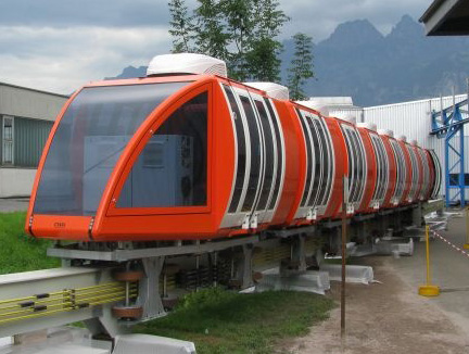 Chur, Switzerland. A new minirail system has been developed by PPH Transsystem AG of Lancut, Poland. Transystem is a handling systems provider with offices in several European countries as well as one in the USA. Bartholet Maschinenbau AG fabricated the train and track at their facility in Chur, Switzerland. The test train is slated to become a transport system in Taiwan. The minirail technology was also being developed for a proposed seven-kilometer urban transport for Rzeszow, Poland. The Rzeszow project would have featured larger trains, but was cancelled recently in favor of an expanded bus system. The so-called 'Catterpillar' monorail features eight cabins linked together on top of a steel straddle bogie system. Each cabin can carry up to six passengers.